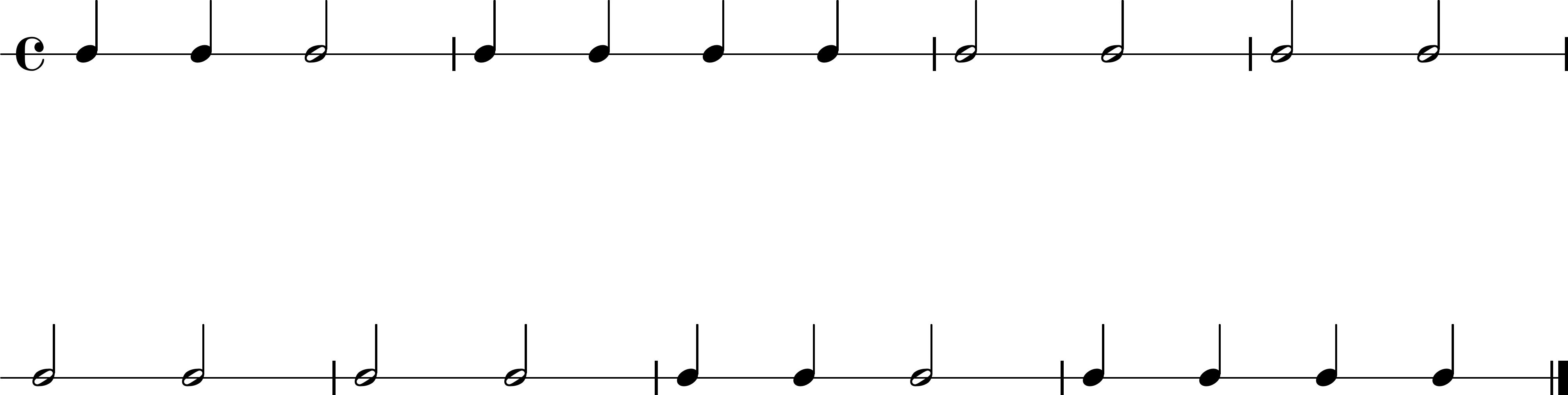 Bloß warum macht man diese Art der Aufteilung? Sonst entstehen einerseits ungünstige optische Löcher und man spart Platz. Weil ich Zweifel hatte, ob das sich eine Grundschülerin so richtig vorstellen kann, habe ich eines meiner Notensatzprogrammen befragt, ob es den Unterschied darstellen kann. Heraus kam folgendes Beispiel. Die obere Zeile, ist die mit den direkt proportionalen Abständen, die untere ist die mit korrekt gesetzten Abständen.