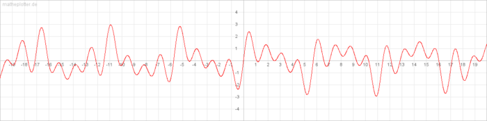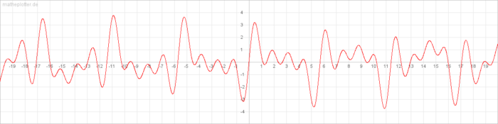• F(x)= sin(1x)+sin(2,22x)+sin(3,33x)+sin(4,44x) (Inharmonische Schwingungen)