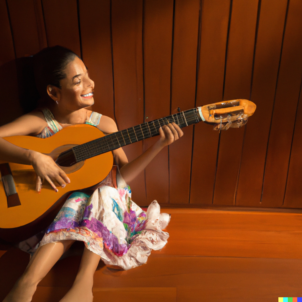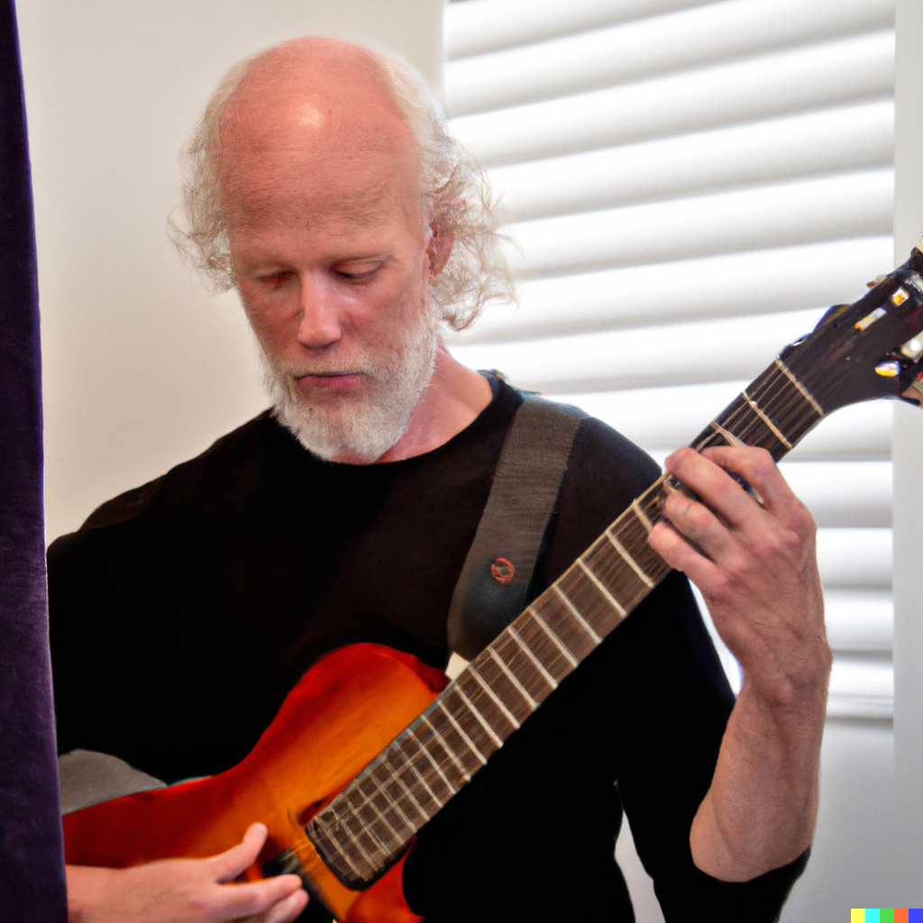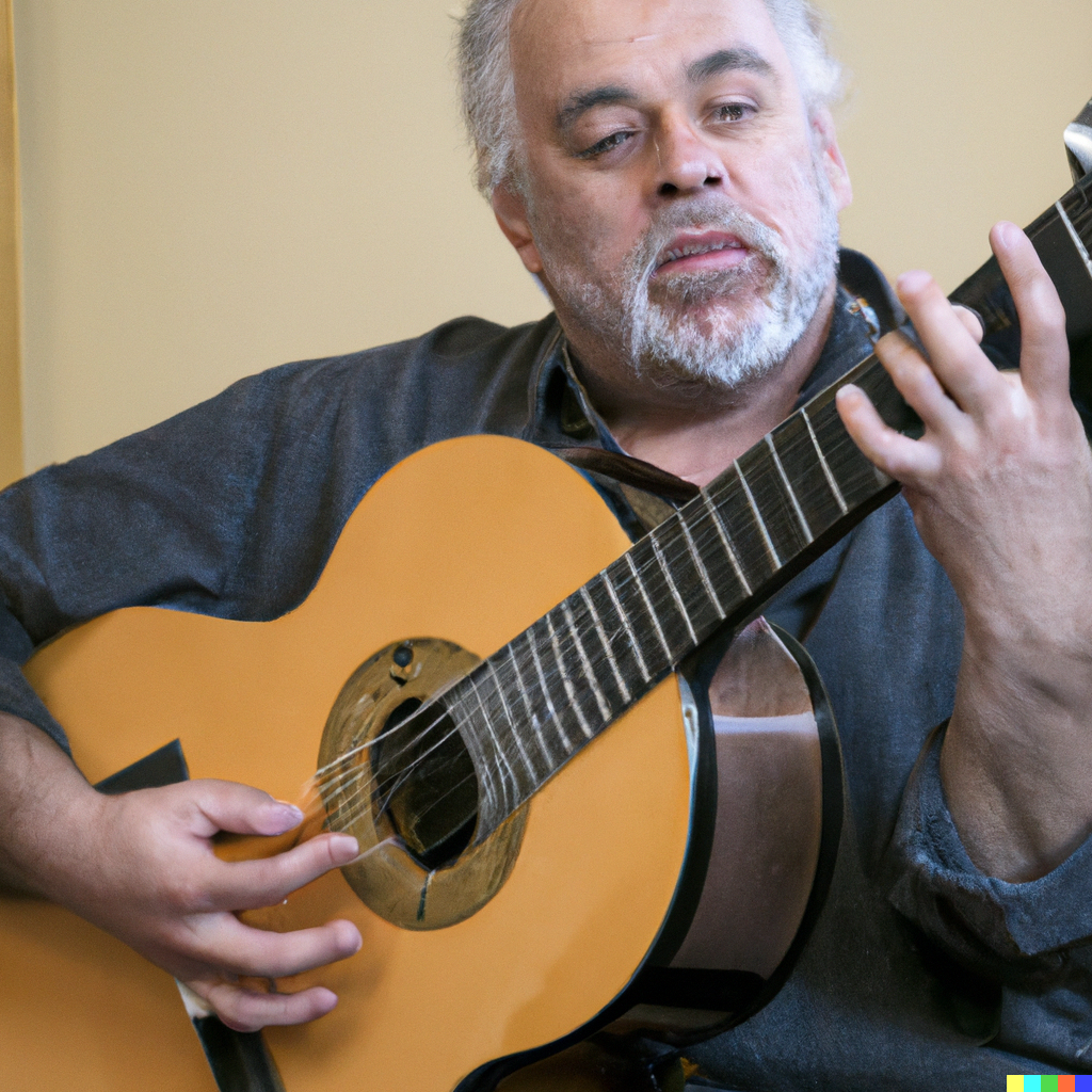 Das war aber nicht der Grund, warum ich in solche Software mit dem Begriff “klassische Gitarre” traktierte, sondern profane Dinge. Vor ein paar Monaten gab es einiges mediales Aufsehen um KI, die Bilder generiert. Nun gut, ich dachte mir, vielleicht könnte ich ein neues Logo für meine Webseite entwerfen. Das probierte ich mit Dalle-E-2 aus.