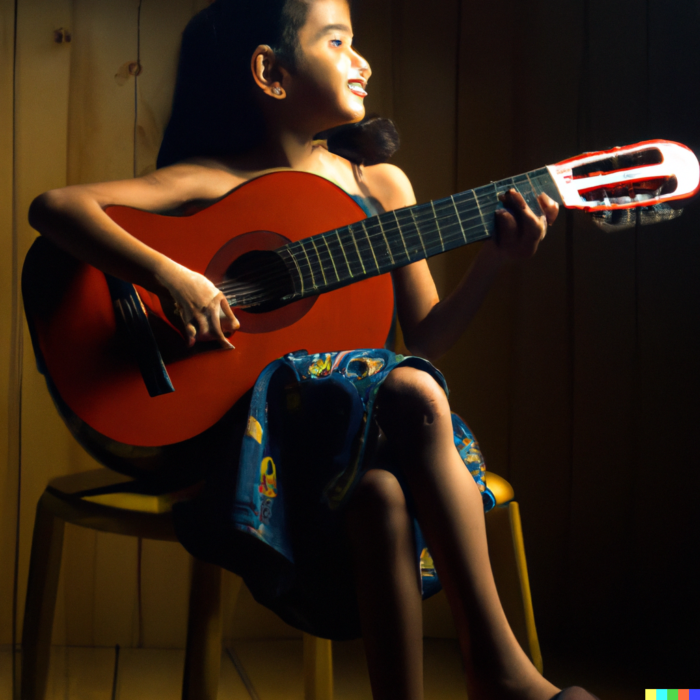 Happy girl at the age of 8 playing classical guitar. The girl is sitting on the left side of the picture. Warm light from the right. The floor and wall are made of dark wood.