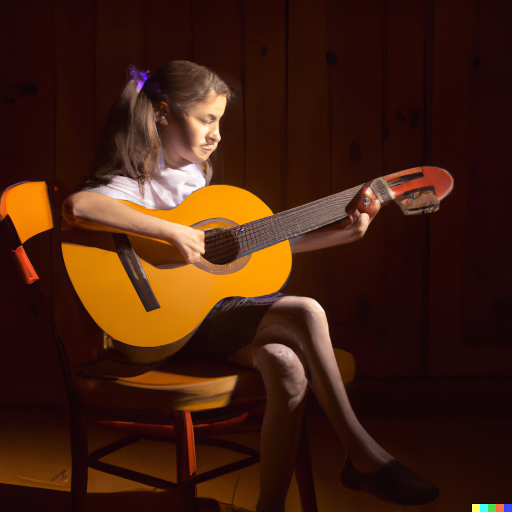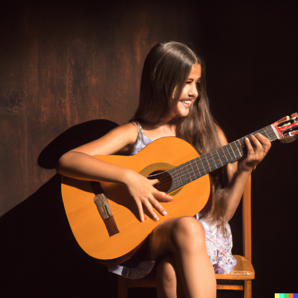 Happy girl at the age of 8 playing classical guitar. The girl is sitting on a chair, playing the guitar with classical guitar posture. Warm light from the right. The floor and wall are made of dark wood