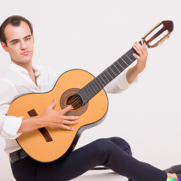 Show the whole Classical Guitar posture. Show the whole body of the player