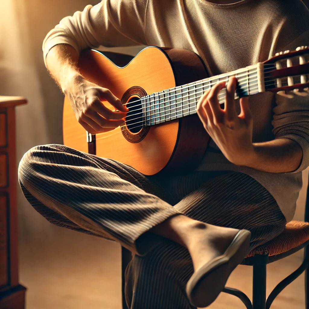 - Bild: Der Gitarrist sitzt mit geradem Rücken, was die klassische, konzentrierte Haltung unterstreicht.