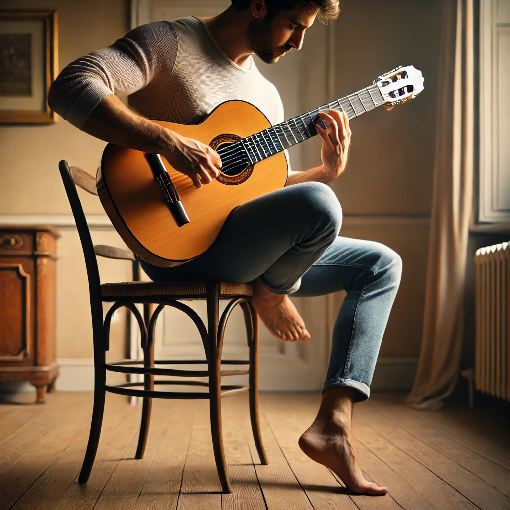 - Sitzhaltung: Der Gitarrist sitzt auf einem schlichten Stuhl ohne Armlehnen.